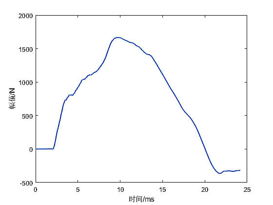 在重質混凝土樓板上測量的橡膠球的撞擊力波形 |