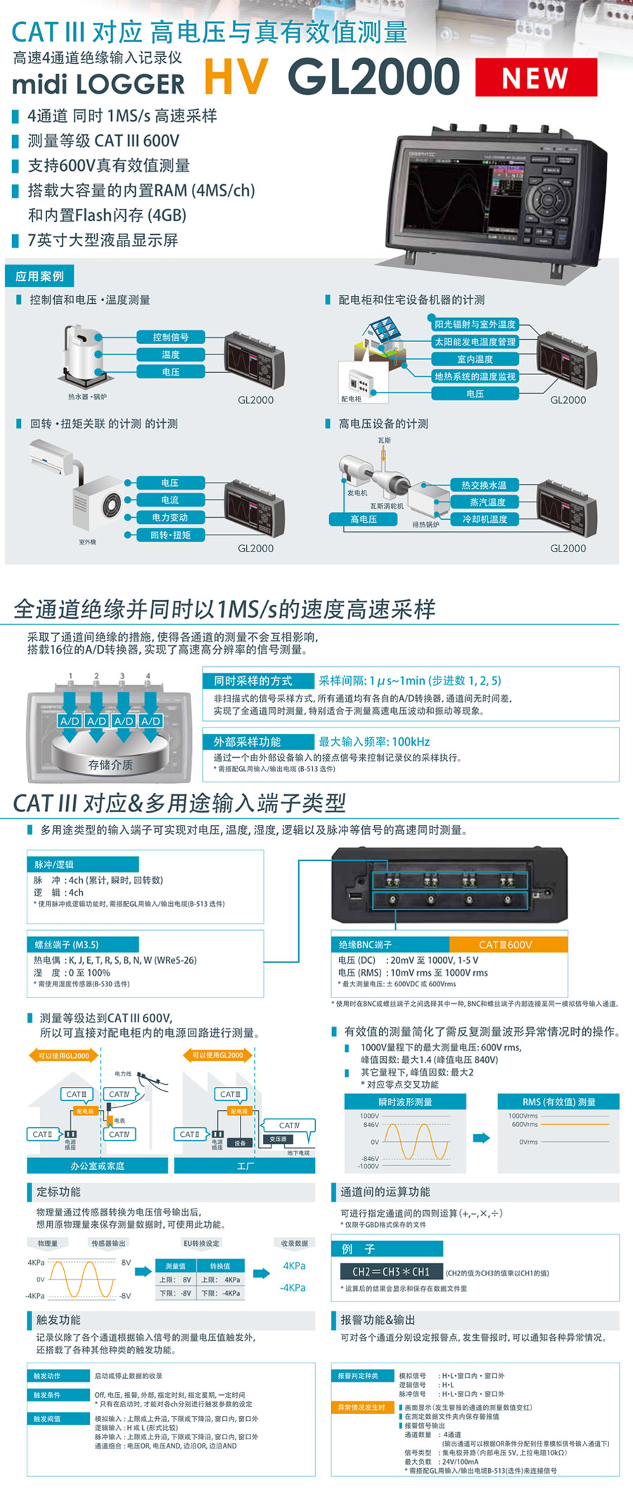 產品描述:日本圖技GL2000多通道數據記錄儀是原GL900-4記錄儀的升級產品,新型號可實現高速 1MS/s 的同步采樣,可以高效測量電壓、電流、溫度、壓力、流量和邏輯信號。對應CAT III 600V以及600V有效值的測量,支持CAT III 600V測量等級要求,可測量三相電源電壓峰峰,值和RMS值的波動........