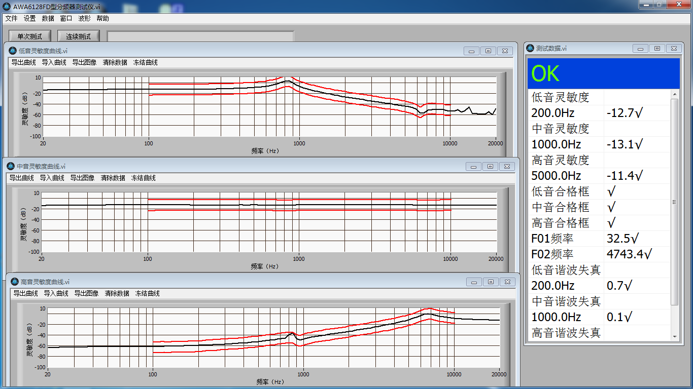 AWA6128FD型分頻器測試儀可以同時測量三分頻的高通(高頻)、帶通(中頻)、低通(低頻)的靈敏度曲線。也可以同時測量二分頻的高通、低通的靈敏度曲線。每個通道靈敏度曲線均可以單獨設置合格框,軟件根據每個通道的靈敏度曲線合格框給出判定結果。儀器特點:全中文的Windows 界面,操作性更強,充分降低初期成本的投入和維護費用,具有高效、強大的分析和處理能力。能快速地完成耳機揚聲器等電聲產品的測試,是基于生產線和質量控制(QC)、操