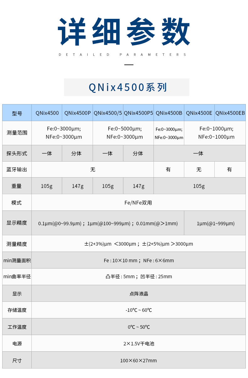 產品描述:QNix4200和QNix4500這兩種型號一體化/分體化設計,只需調零,無需校準,使用極其簡單。其中QNix4200為磁性測厚儀,可以用來測量鋼、鐵等磁性基體上的涂層、鍍層;QNix4500為磁性和渦流兩用測厚儀.........